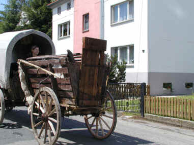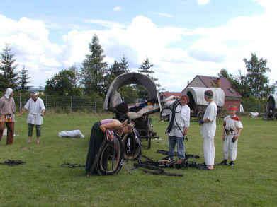 den Rasen um die Wagenburg und bestaunten die Ausrüstung der Besiedler. Wer am frühem Nachmittag schon den Tross der Siedler beobachtete, konnte die zweispännigen Pferdeplanwagen, beladen mit typischen Hausrat und die mitgeführten Tiere wie in einem Film aus dem Mittelalter betrachten. In diesem Jahr rollte der Besiedlungszug zum ersten Mal westwärts durch das Chemnitztal bis in die Täler der Zwickauer Mulde. Im Anschluss ein paar Schnappschüsse zum Besiedlungszug durch Köthensdorf und das Lager auf dem Sportplatz mit mittelalterlichen Spielen und buntem Treiben für groß und klein. (Fotos: Herr Hutschenreuter aus Köthensdorf)